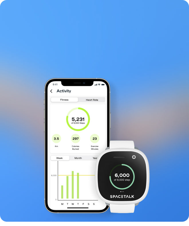 < Spacetalk app costs may apply. The Spacetalk app is free while device uses a Spacetalk Mobile SIM with associated paid mobile plan.