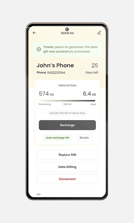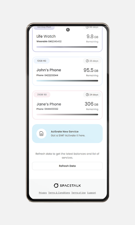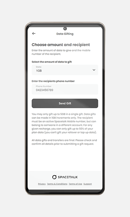 Schenk tot 50% van uw dataverkeer van de huidige maand aan een andere service in uw gezin via hetzelfde Spacetalk-account, zonder kosten of extra kosten.