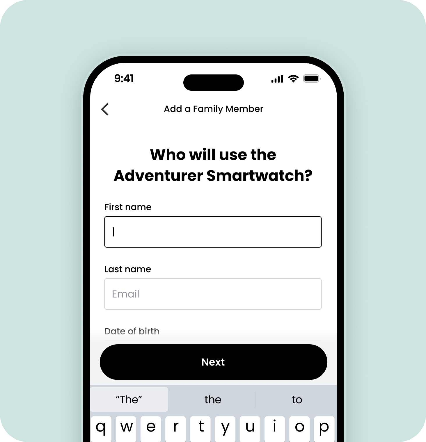 Følg instruksjonene for å opprette familien din. Skriv inn dine egne opplysninger som forelder i familien. Du vil bli bedt om å oppgi barnets opplysninger når du kobler klokken.