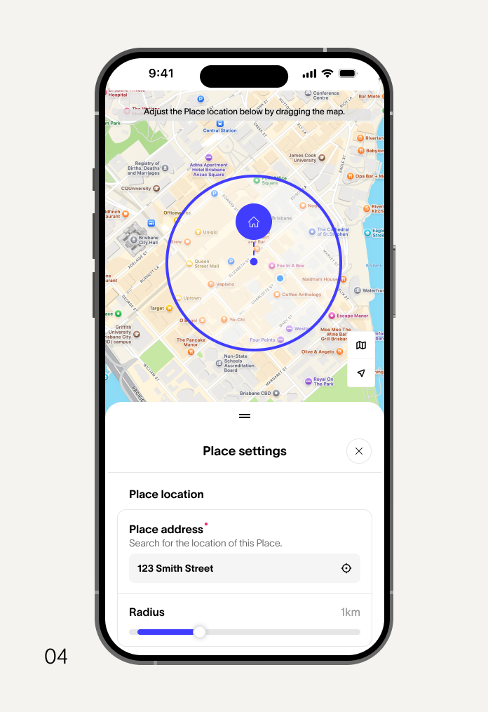 To set up the Place, just enter the address and if you want, adjust the radius.
