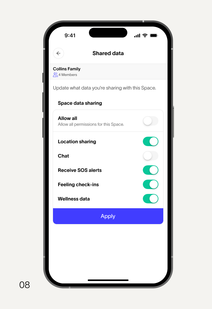 Adjust the settings of what your child shares with the members of the Space and tap apply.