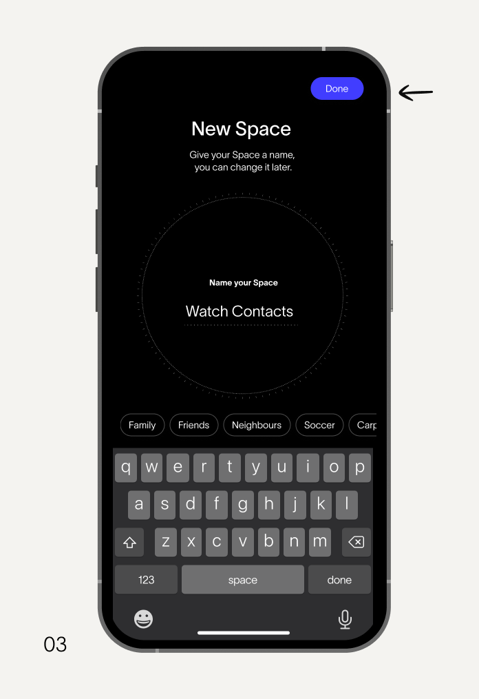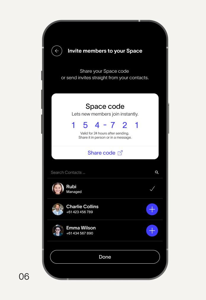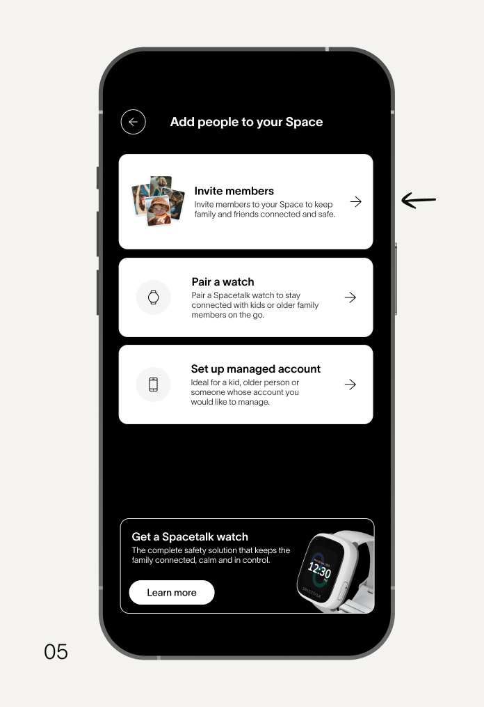 Add the managed member with the watch (for example, your child) as well as any member you want to allow to contact them, by tapping the + button. Once you have invited everyone, tap “Done”.