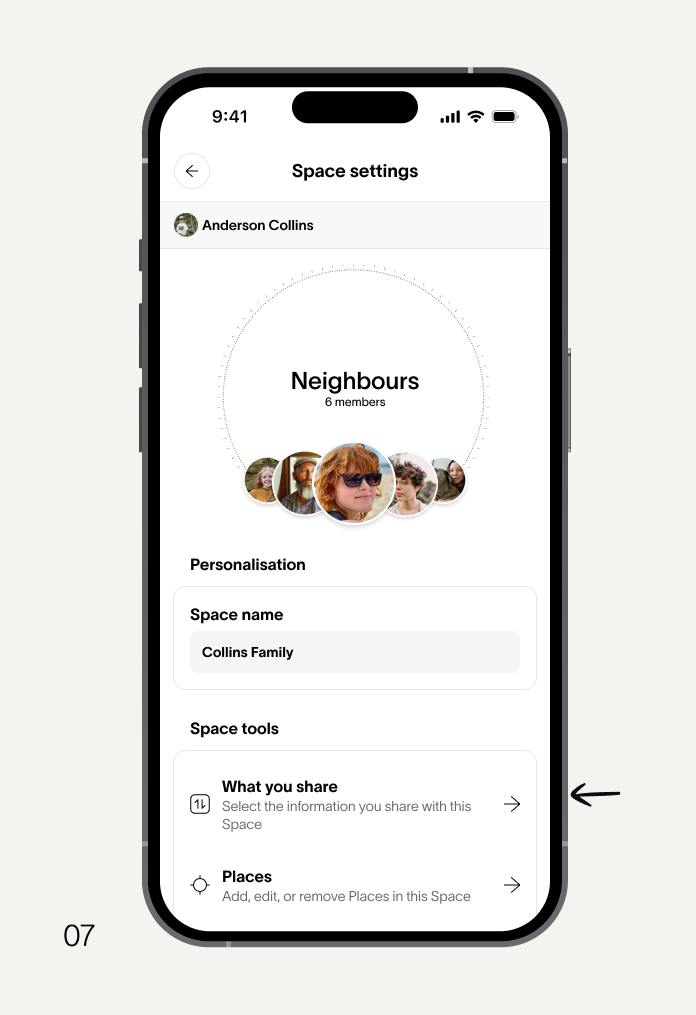 Tap on the “What you share” option shown above. If you scroll further down, you can also manage what all your managed members share in each space via the “Member management” option and tapping on the member name.