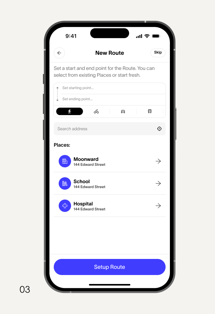 Select the starting and ending point of the Route. If you have set up Places like School or Home, you will be able to select them directly.